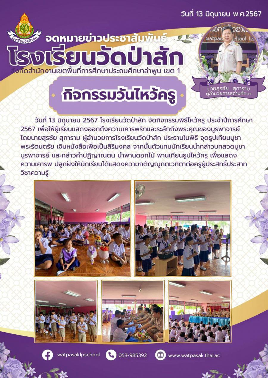 วันที่ 13 มิถุุนายน 2567 โรงเรียนวัดป่าสัก จัดกิจกรรมพิธีไหว้ครู ประจำปีการศึกษา 2567 เพื่อให้ผู้เรียนแสดงออกถึงความเคารพรักและระลึกถึงพระคุณของบูรพาจารย์ โดยนายสุรชัย สุการาม ผู้อำนวยการโรงเรียนวัดป่าสัก ประธานในพิธี จุดธูปเทียนบูชาพระรัตนตรัย เจิมหนังสือเพื่อเป็นสิริมงคล จากนั้นตัวแทนนักเรียนนำกล่าวบทสวดบูชาบูรพาจารย์ และกล่าวคำปฏิญาณตน นำพานดอกไม้ พานเทียนธูปไหว้ครู เพื่อแสดงความเคารพ ปลูกฝังให้นักเรียนได้แสดงความกตัญญูกตเวทิตาต่อครูผู้ประสิทธิ์ประสาทวิชาความรู้