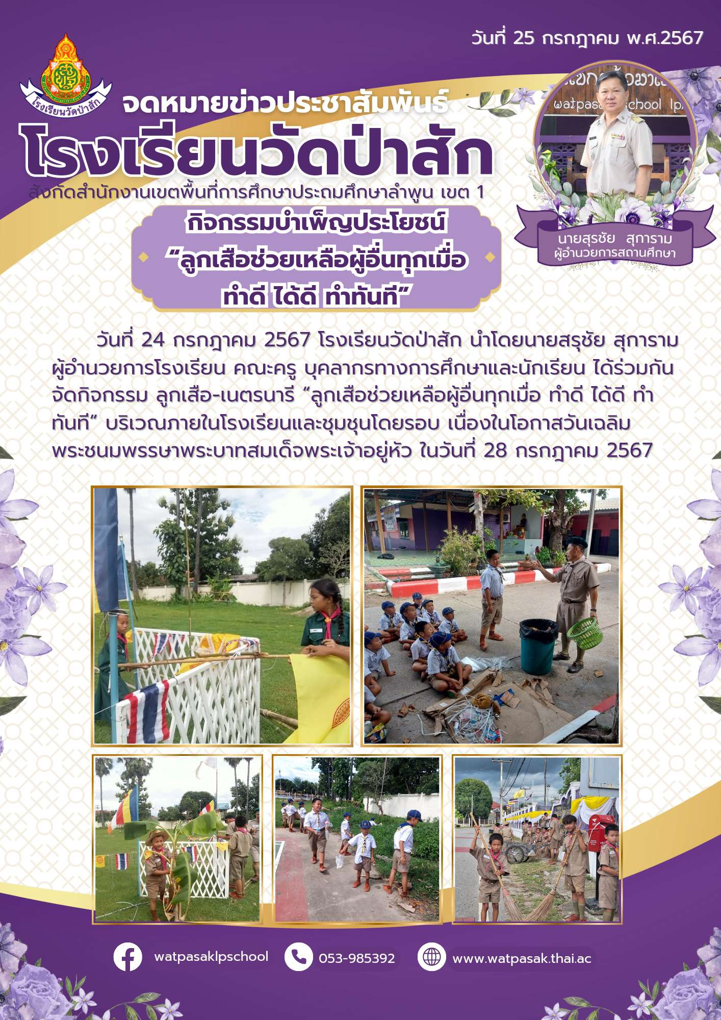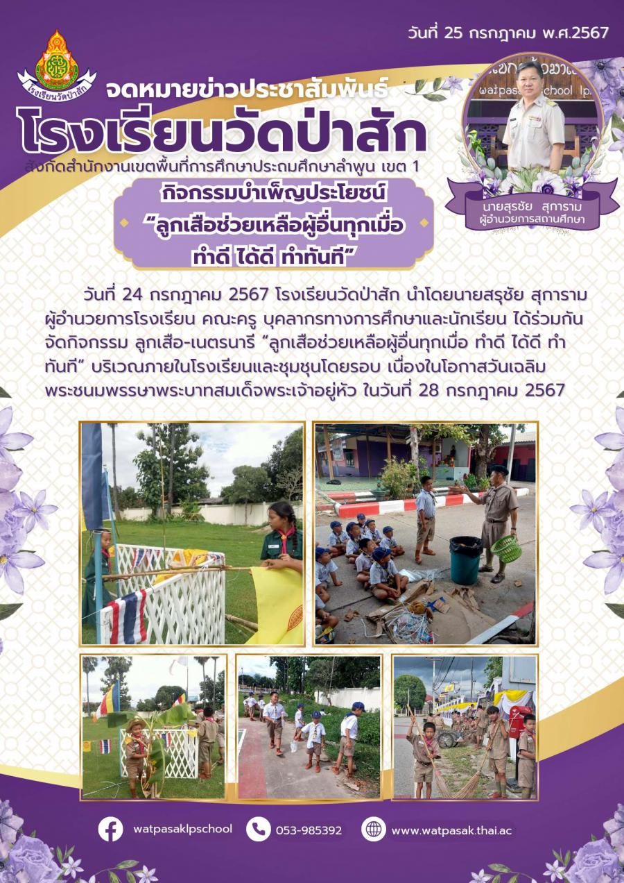 วันที่ 24 กรกฎาคม 2567 โรงเรียนวัดป่าสัก นำโดยนายสรุชัย สุการามผู้อำนวยการโรงเรียน คณะครู บุคลากรทางการศึกษาและนักเรียน ได้ร่วมกันจัดกิจกรรม ลูกเสือ-เนตรนารี ?ลูกเสือช่วยเหลือผู้อื่นทุกเมื่อ ทำดี ได้ดี ทำทันที? บริเวณภายในโรงเรียนและชุมชุนโดยรอบ เนื่องในโอกาสวันเฉลิมพระชนมพรรษาพระบาทสมเด็ดพระเจ้าอยู่หัว ในวันที่ 28 กรกฎาคม 2567